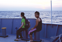 デッキで海風に吹かれている福井ひろ子先生(36)は、「人生の大事な時期に、学校ではできない経験をしてくれたら」と、この実習の担当者として今回の研修に期待する。