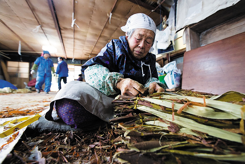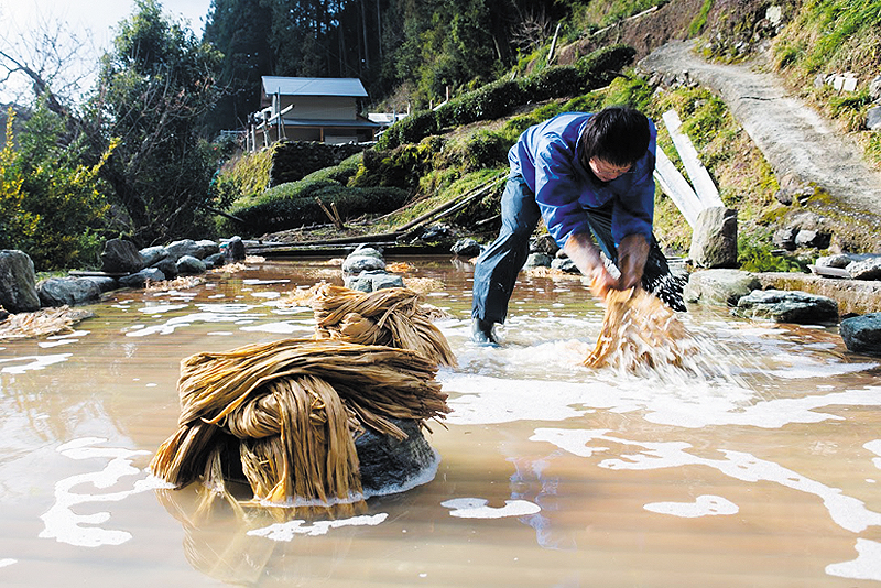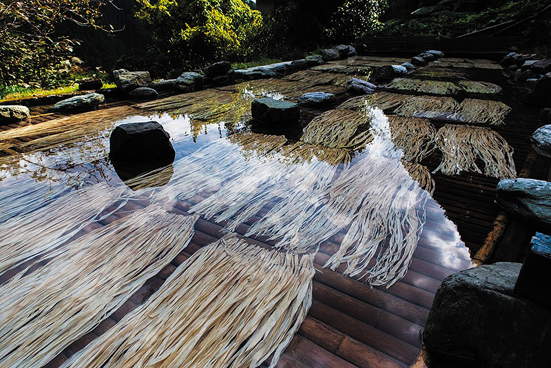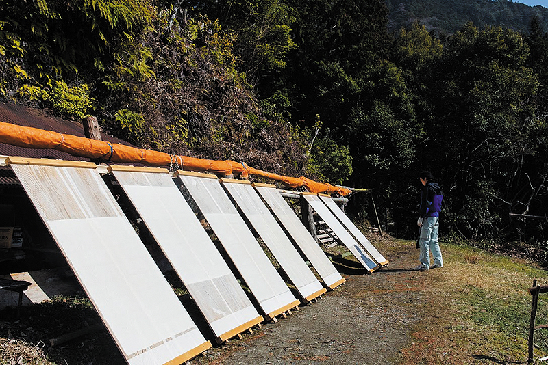 畑で育てたコウゾを蒸して皮を剥ぎ、加工して水に浸け、煮て流水にさらし、チリ取り…。それらの行程を経て紙漉き。熟練の技で漉かれた和紙は、日当たりの良い山の斜面に運ばれ、1枚ずつ天日に干されてようやく完成する。これら全てを自家製で行なうのは全国でも稀だ。 ※写真/©Eisaburoh Hosogi