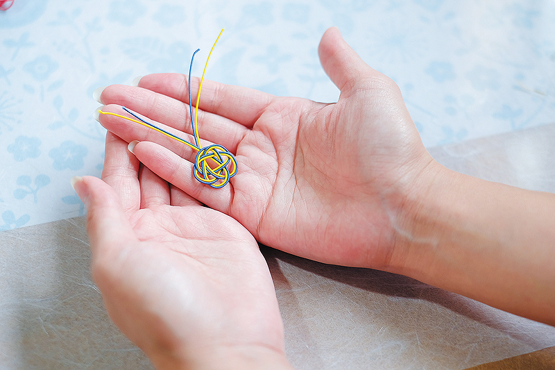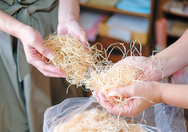 1.サシェの袋も、もちろん土佐和紙。「青海波」や「麻の葉」など、意味のこもった模様もあしらわれている。2.香りのタネとなるのは県内産の木毛。地元にある木毛製造専門の会社がつくっており、ヒノキかクスノキから好きな香りを選べる。3.アクセントとなる水引(みずひき)の芯部は和紙のこより。のし袋などで完成品を目にすることがほとんどだが、ここでは自ら結ぶチャレンジも。4.日本文化では、結ぶことに「心をつなぐ」というニュアンスを込めていたもの。最初は難しくても、練習すれば誰でもきれいに結べる!