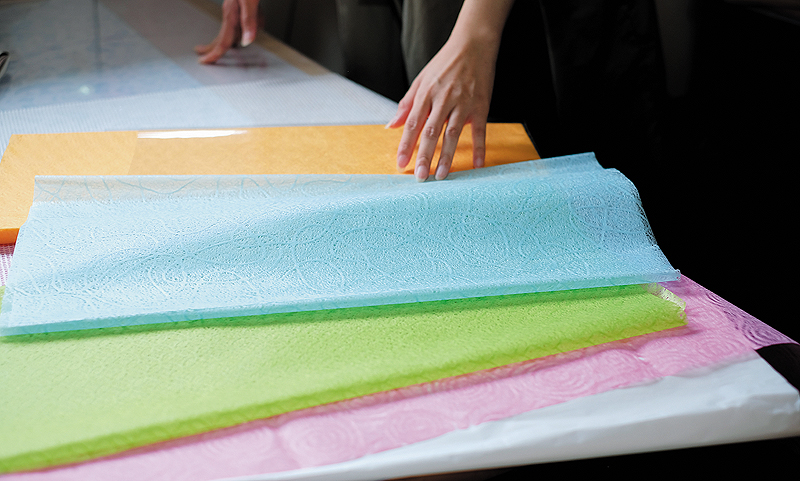 1.まずはプレゼントを包む和紙選び。「落水紙」や「もみ紙」など、それぞれで異なる風合いがある。結婚、出産といった、シーンにふさわしい模様なども考える。2.見栄えのよい包み方のレクチャーはお手のもの。受け取る相手が最初に感じる手触りも、土佐和紙を使えば特別なものに。3.リボン結びも、ただ袋を留めるものではなく、送る相手やシーンによって結び方が変わってくるもの。相手のことを想像しながら気持ちを込めることが大事。4.結び口から和紙を引き出して、ふわふわとさせたらフィニッシュ。くしゃっとさせても破れない、丈夫な土佐和紙ならではのポイント。