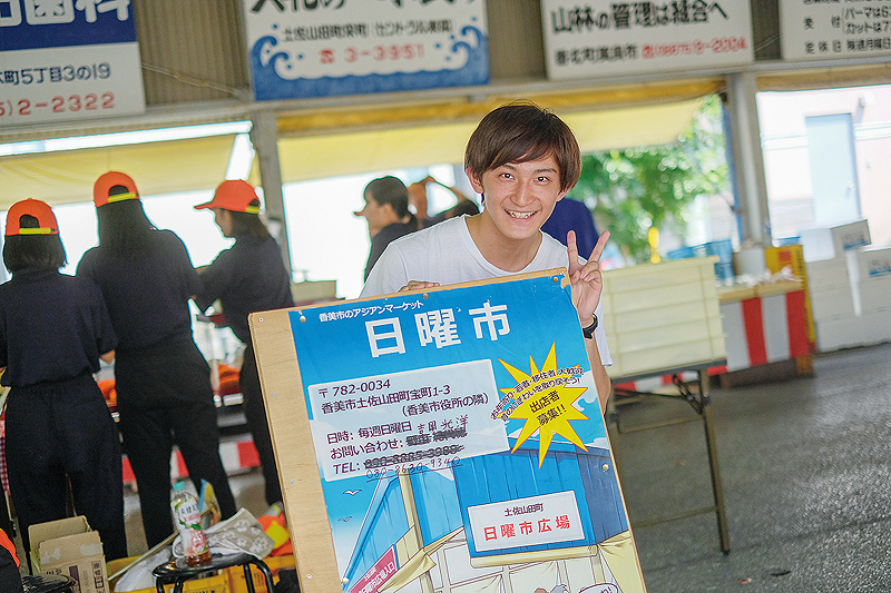 そんな土佐山田の日曜市も、先代からお店を受け継いだり、あるいは移住でこの地に新たにやってきたりした新しい人達によって、その歴史が続けられている。土佐山田町には高知工科大学があるため県内外から若者も多く訪れており、「日曜市活性化サークル」に所属する大学生の坂田くんは、「いろいろな学生サークルが参加するイベント「おはまる市」で、今年も市を盛り上げます!」と元気に話す。高知商業高校の生徒たちも、この地域で問題になっている獣害を解決するため、地元産のジビエを用いた商品を販売しながら、「若者のパワーで笑顔になってほしい!」と、とっても元気。土佐山田の日曜市は、長い歴史を持つ地域コミュニティであり、志ある若者の活躍の場でもある。が溢れている。