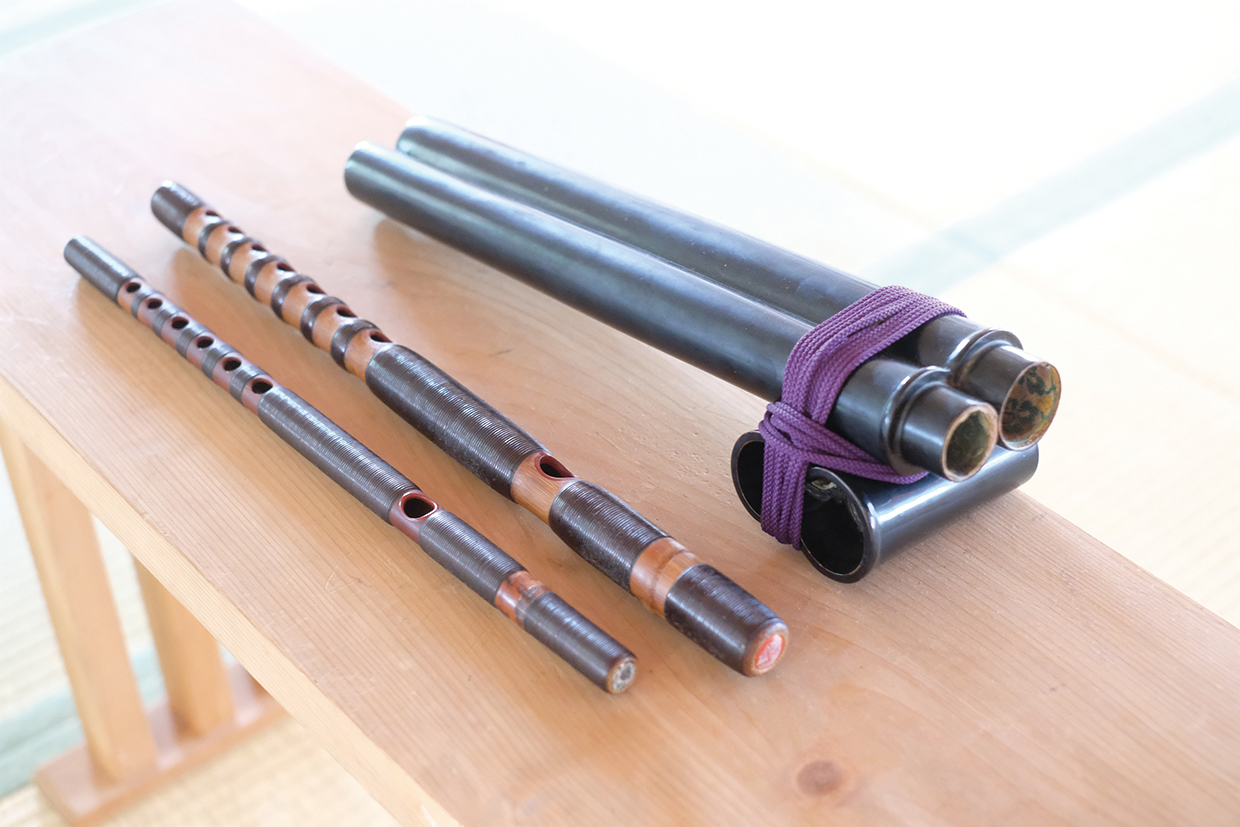 日本に帰って来てからは、国内外で行われる演奏会に参加する他、自主公演もいくつか手がけた。2014年には平家物語を、2015年には陰陽師をテーマに、古典雅楽に洋楽や声楽などを織り交ぜた新しい舞台を披露し、多くの観客を魅了した。また2016年からは高知県在住の弦楽器、管楽器で構成されたバンド「fairy pitta」のメンバーとして活動するなど、まさに精力的だ。ちなみに雅楽のピッチは430ヘルツだが、洋楽のピッチは440ヘルツ。この10ヘルツの違いを補うために洋楽専用の龍笛をオーダーメイドで構え、演奏会に合わせて2本を使い分けるのだそう。また演奏家としての活動の他にも、四万十市で龍笛レッスンを行ったり、海外の方にはオンラインで教えたりもしており、時代に沿ったかたちで龍笛を、そして雅楽の素晴らしさを伝え続けている。「芸術というのは自分の心を表現するものであり、それ以上でもそれ以下でもありません。上手く吹きたいという気持ちは時に煩悩となり、その感情を超えたところに個性があり、それを出すために日々鍛錬を重ねています。終わりがない世界でとても難しいですが、そこが面白いんです」。