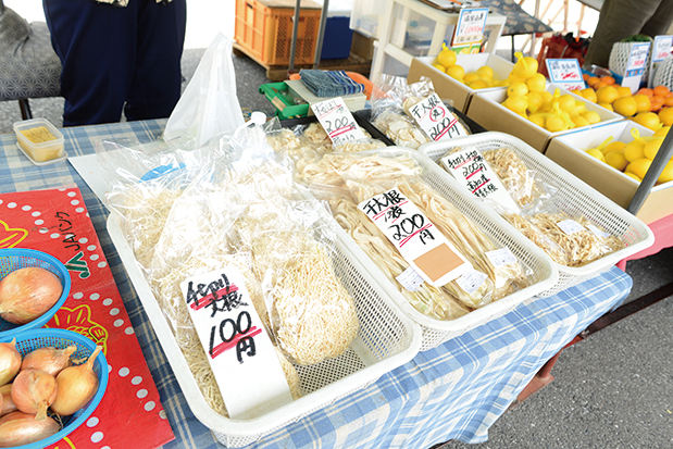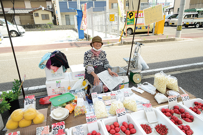愛宕商店街の中頃を横切るJRの高架下で、毎週金曜日に行われている「金曜市」の歴史は1926年に遡る。当時の朝倉町で誕生した街路市がルーツで、その後、1950年代に愛宕へ移転。そして市道が整備され、2009年、高架下の敷地に「愛宕町広場」が誕生したのをきっかけに、この広場で開催されるようになった。「今は1列だけになったけど、以前は2列になってたくさんの店が連なって、時間も朝から夜の19時過ぎくらいまで行われていたんですよ」と古くから金曜市で出店を続ける方々は教えてくれた。その言葉通り現在は200m強の距離に15店舗ほどが軒を連ね小規模なものとなっている。しかし、お客さんとお店の方がやり取りを繰り返すその活気は他の街路市同様。近くの住宅街に住む地元の人々を始め、プロの料理人達もこぞって訪れているという。
