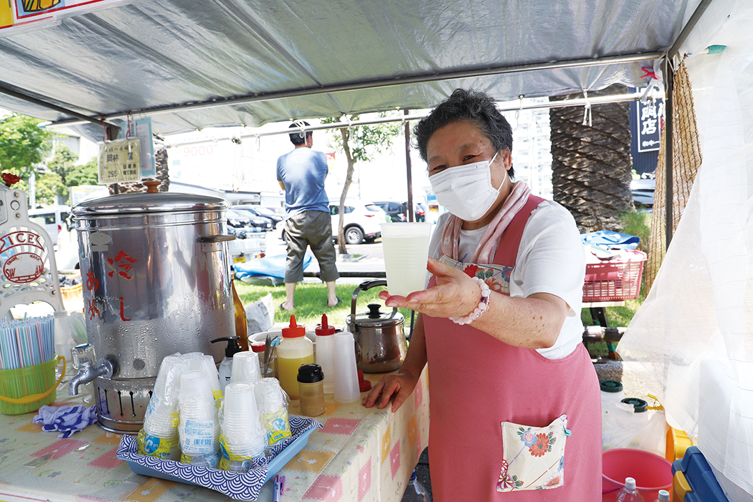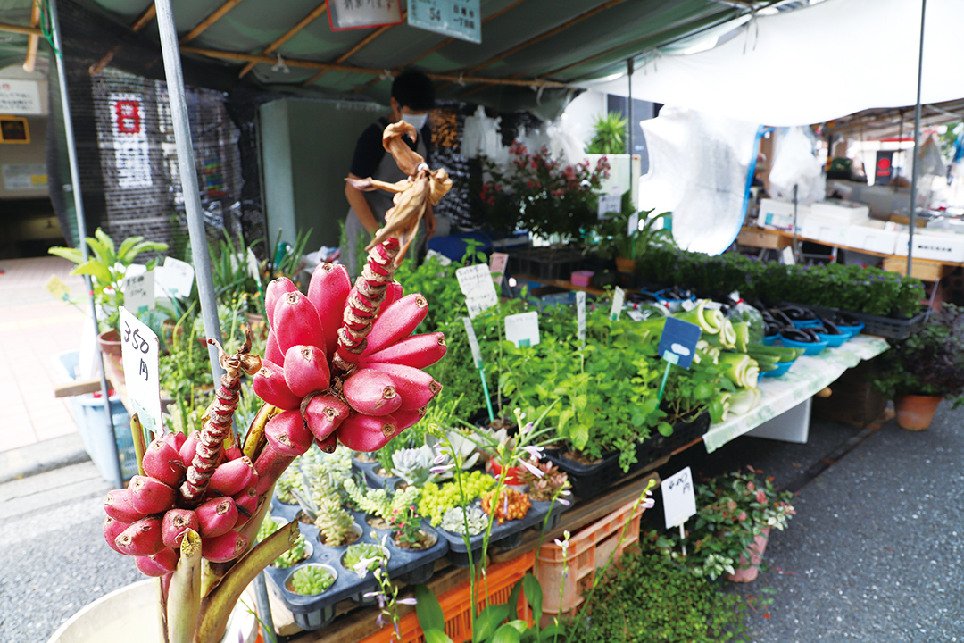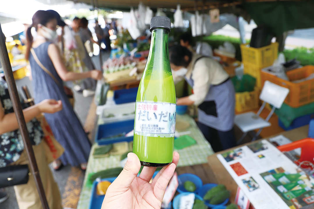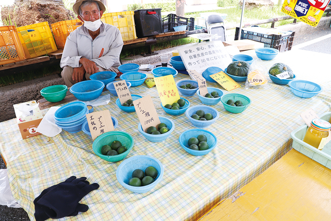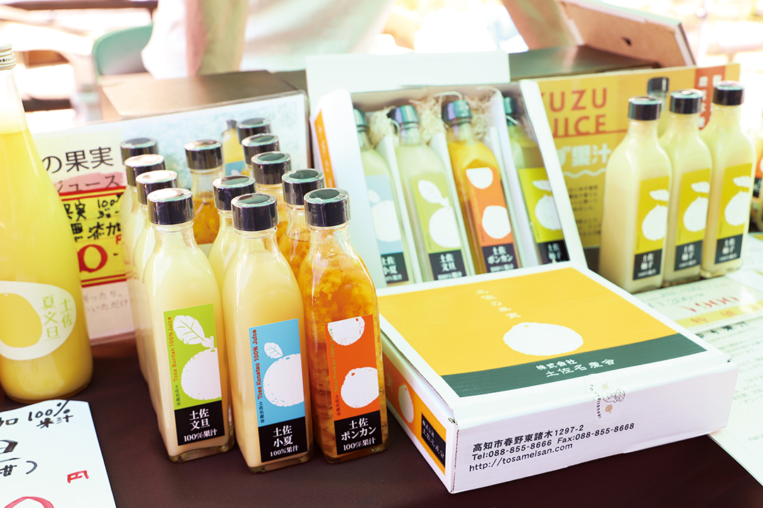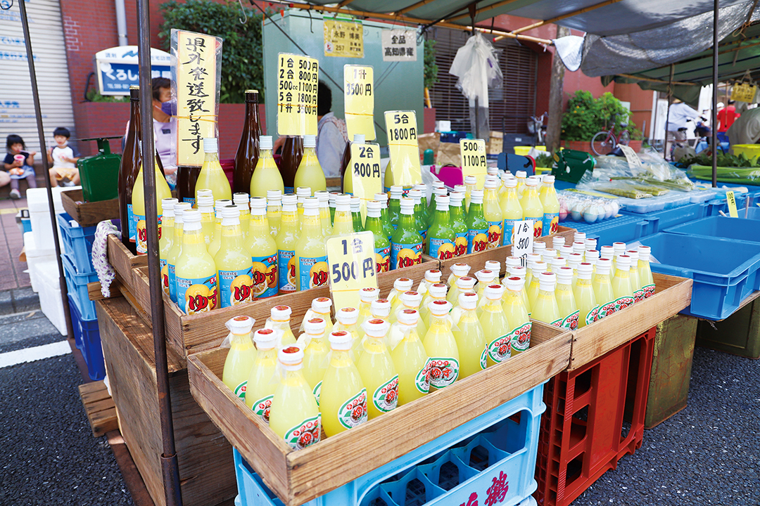 日本一長い街路市だけに、さまざまなお店が並ぶ「日曜市」。実は酢みかんを取り扱う店も数多いことをご存知だろうか。今号の発行時期に当たる秋口に旬を迎える酢みかんといえば「ゆず」を思い浮かべる人も多いかと思うが、先代から合わせて50年以上出店し、酢みかんを売り続けてきた井上さんの店では、秋口は有機栽培で育てたワイルドライムや青切りのレモンも並ぶ。また、酢みかん自体のラインナップはもちろん、瓶詰めにした果汁や、その果汁を使ったポン酢、ドレッシング、ドリンク、ゼリー、さらには化粧水まで、酢みかんを使った加工品も多種多様にそろう。また、「酢みかんの玉とか果汁は高知の人が買っていくけど、加工品は県外の方がお土産に買っていくことも多いねぇ」というお店の方からの声も多く、県外への土佐の酢みかん文化の浸透に、日曜市が一役買っているようだ。
