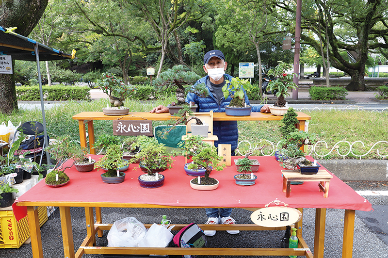 大橋通りを西へ過ぎた通り、いわゆる「日曜市6丁目」と呼ばれるエリア。こちらには、盆栽や苗木、さらに今回作り方を教えてもらった「コケ玉」など植物系の商品をそろえるお店や、打刃物、金物、骨董品や雑貨などをそろえるお店が多数並ぶ。令和元年10月から日曜市に出店を始めたという盆栽の店「永心園(としんえん)」の山岡さんは、「同じ盆栽でも、お店によって大きさや作風が異なる。それぞれのお店を見比べてみてほしい」と語る。中にはその場で手書きした表札を販売するお店も。「廣田表札工芸」の廣田さんは、日曜市での出店は3年ほどだが、この道40年の大ベテラン。「名前とか店名以外でも好きな言葉を書くきねぇ。なんでも言うてよ」と、美しい文字で表札を作ってくれるのはもちろん、ノリの良い接客も魅力のひとつ。高知城を眺めつつ、ぜひのぞいてみて。