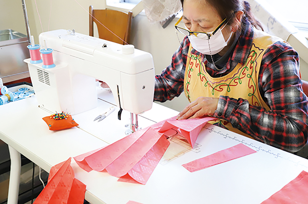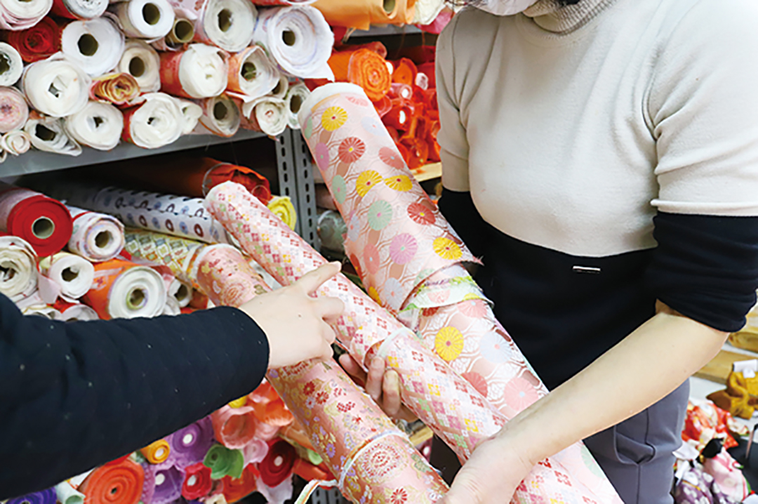 「お祖母さまの形見の着物帯を使ってひな人形を作る方もいらっしゃるんですよ」、そう言って工房を案内してくれたのは「アオイコーポレーション」の代表・楠目和子さん。昭和43年に「葵人形」として創業。代々家業として行ってきたひな人形作りを継承し、現在は同社の人形事業部で、2人の職人と共に、ひな人形作りの伝統を守り続ける。工房に並ぶのは、西陣織の金襴などをはじめとする、300種類以上に上る色とりどりの生地。その中から、好みの色・柄・素材を選んで自分だけのオリジナルひな人形を作ってくれる全国でも数少ない工房。色とりどりの十二単を着たおひなさまともなると、選ぶ生地や小物も十人十色で、出来上がった人形は一つ一つが個性的。「自分が選んで作ったおひなさまが一番。そう言って喜んでくれるんですよ」と楠目さんは頬を緩める。 今では大量生産による機械化が進むひな人形作りだが、ここでは、ワラや木毛(もくめん)、針金を使って胴体や手足を作るところから始まり、何十種類ものパーツを裁断し縫製して組み合わせていくという、気の遠くなるような作業が職人の手によって進む。「無病息災を願ってひな人形を飾る」という元来の意味を大切にするからこそ、代々引き継がれた昔ながらの製法にこだわり続けている。