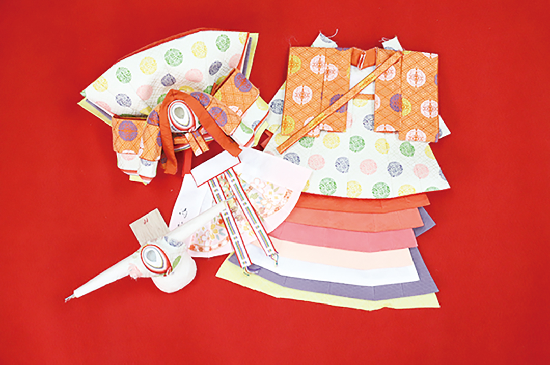 1「裁断・縫製」めびなで40種類以上のパーツを裁断。一つ一つミシンで縫い合わせていく。人形の衣装はパーツが小さいため作業も細かい。2「十二単が完成」赤・黄・オレンジ・ピンクに紫など色とりどりの衣に、西陣織の金襴を使ったあでやかな衣。縫い合わせた十二単の数、十種類以上。3「胴体を作る」ワラ・木毛(もくめん)を用い、針金を駆使して作った胴体は、どっしりとした安定感が特徴。そこに襟元、袴、十二単の順に着せていく。4「衣裳を着せる」白襟から唐衣まで一枚ずつ衣装を着せていく。襟元、袖元の絶妙な重ね技はミリ単位。熟年の職人技が必要となる。5「お顔を装着」首元にお顔を装着したら出来上がり。おびなも同様の作業で行われるが、めびなの製作に比べると工程は4分1以下。完成!