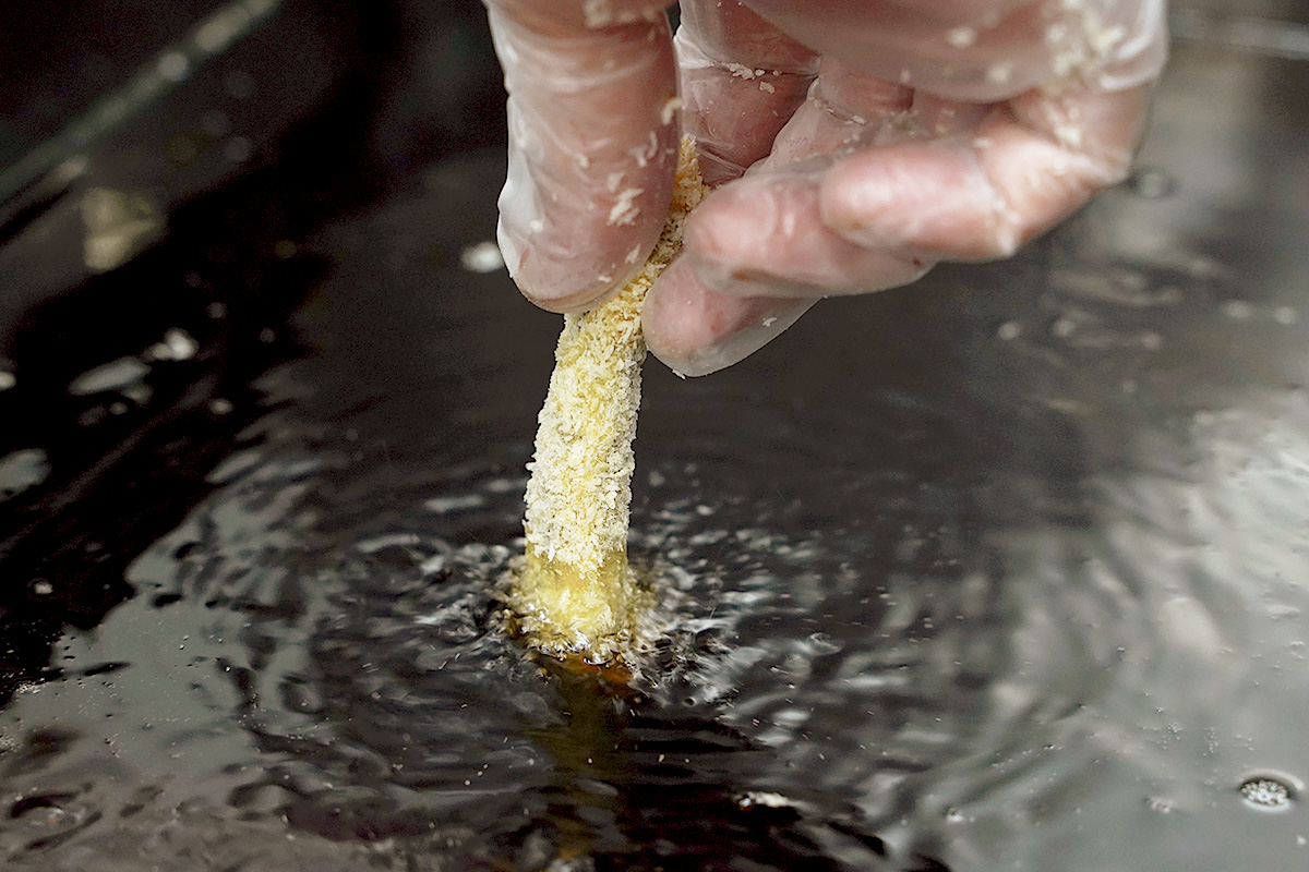 手順4/170~180度に熱した油で揚げる。目安は3分。衣がキツネ色になるまで、こんがり揚げる。
