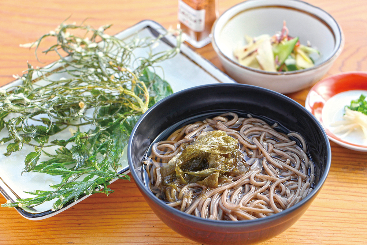 「水辺の駅 あいの里」の仁淀川をのぞむ食堂では、「野草天ぷらそば」や「和ハーブスープ」なども提供している。写真右は、クラフトコーラ「sawachina」の素材にも使用されている「ヤブニッケイ」。