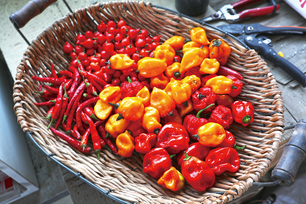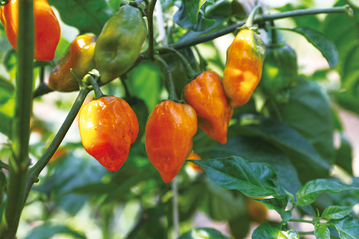 現在では、年間を通じて、十種類を超えるさまざまな唐辛子を栽培。独特な辛味とフルーティーな香りが特徴の「オレンジハバネロ」、刺すような辛さがある「キャロライナリーパー」、マイルドな辛さに旨味がのる「カシミールチリ」…。世界のさまざまな唐辛子を栽培し、色とりどりの実を太らせている。