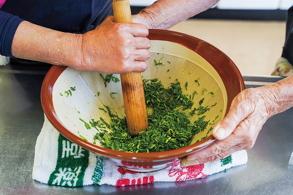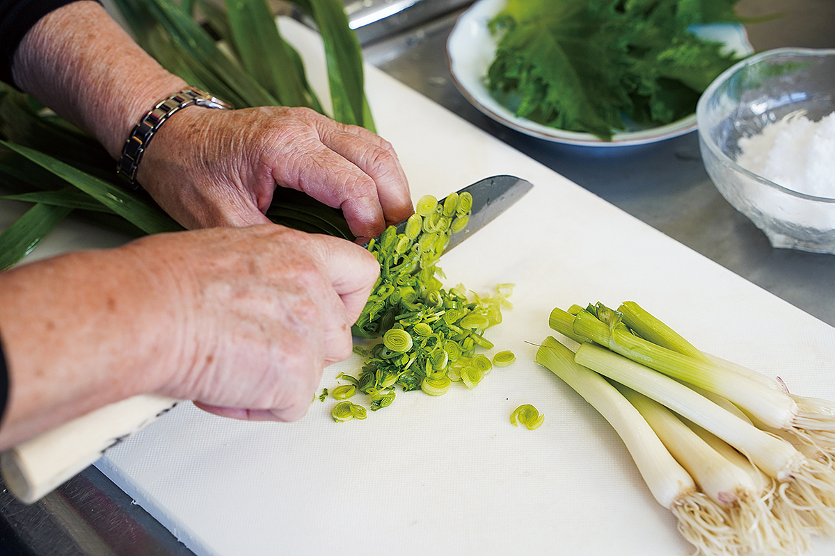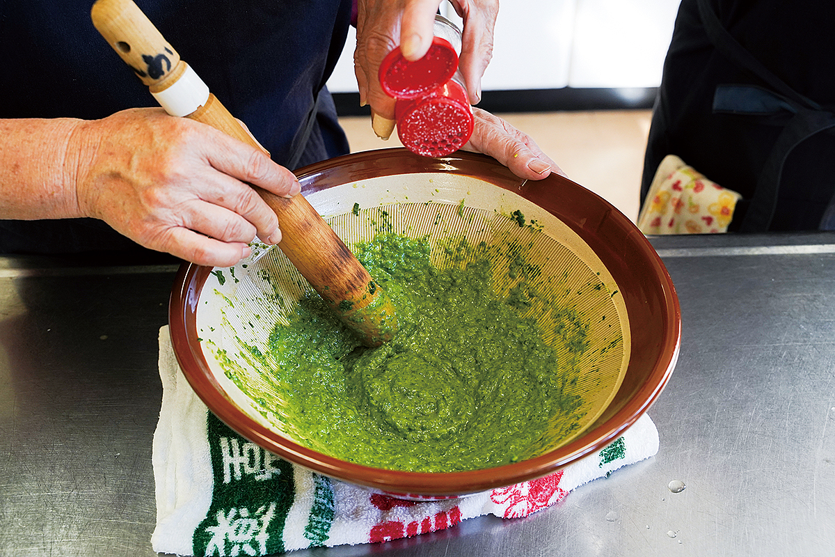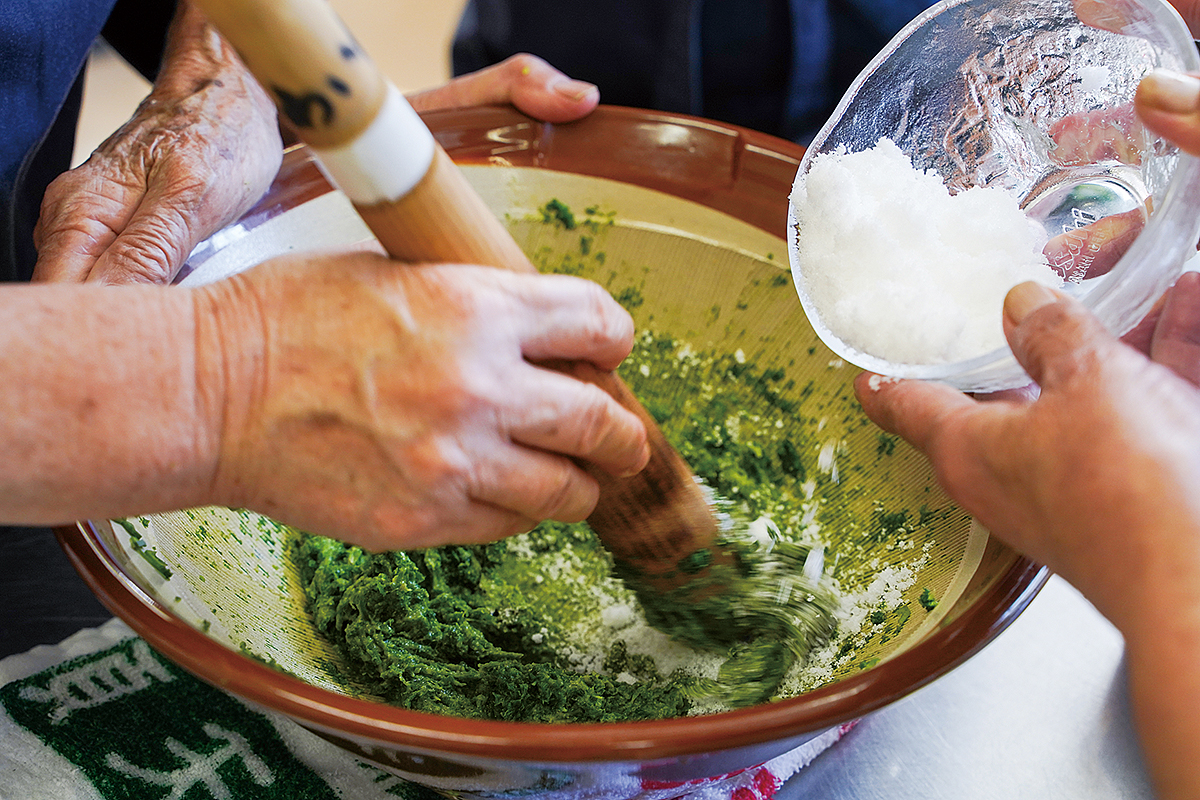 手順2/細かく刻んだ葉ニンニクをすり鉢に移し、最初は叩くようにつぶしてからよくすりつぶす。形が無くなり、まとまるまでが目安。