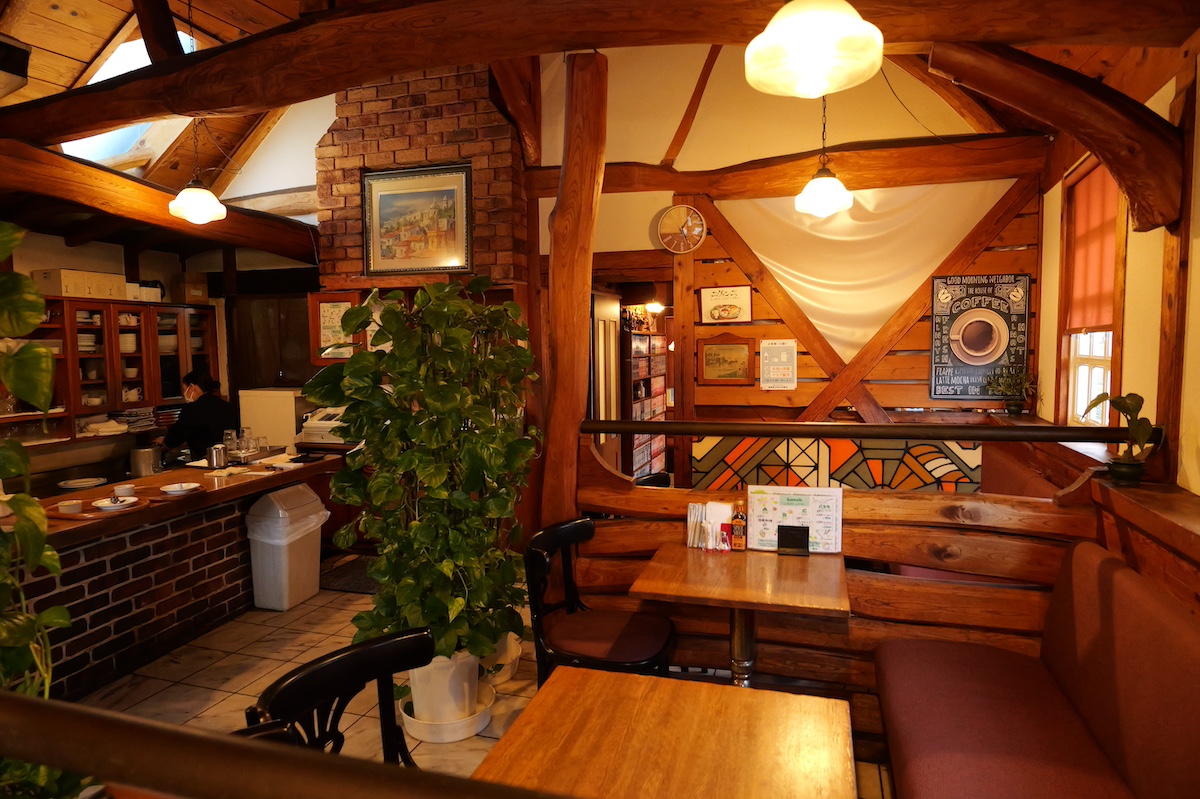「エヴァンス」の店内には、奥へ進むと数段降りるダウンフロアがあり、ちょっとした秘密基地のような空間が広がっている。店主の山本さんがこの建物に出会ったのは、約40年前。新たに喫茶店を始めようとしていた時、偶然目にした建築中の建物に一目惚れしたという。「通ううちに現場の大工さんと親しくなって、そのご縁もあってここで店を開けることになったんです」と、当時を懐かしそうに振り返った。