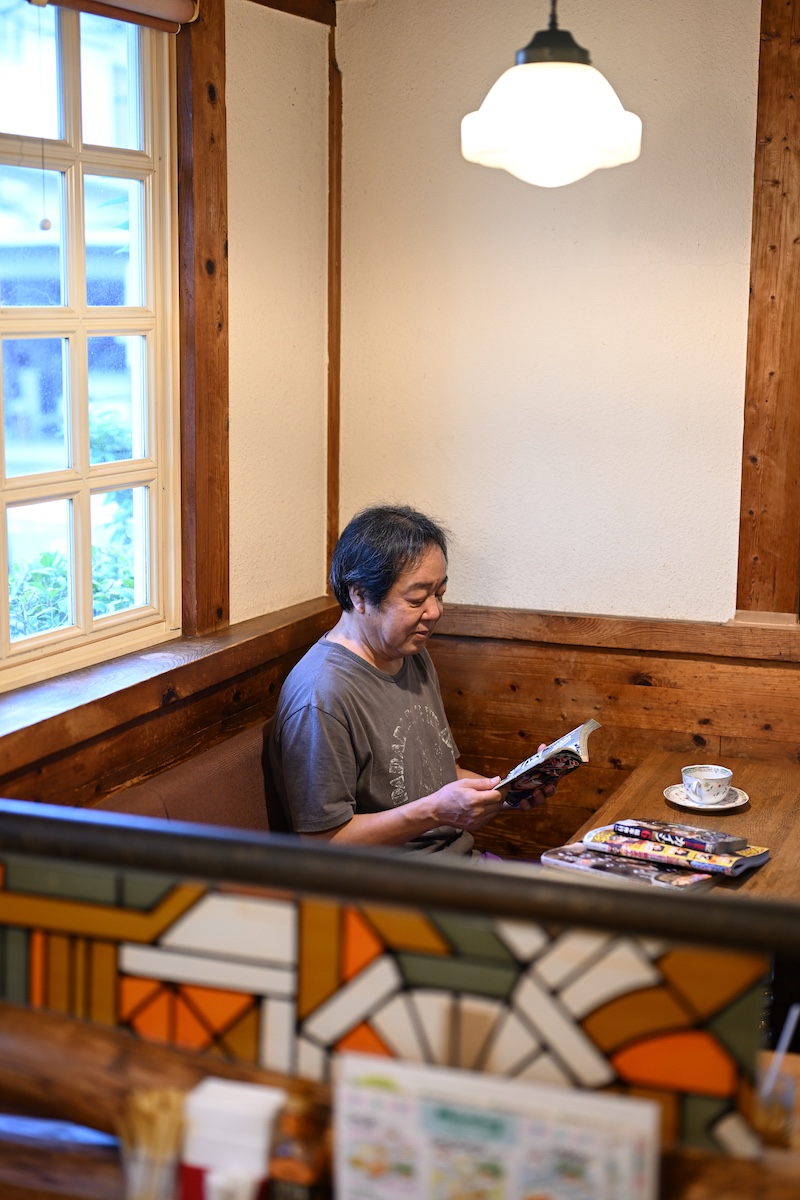 まんが好きのたっちゃんは、店主の古くからの友人。定年で仕事を離れた今でも、週に一度は「エヴァンス」を訪れ、晩ごはんを兼ねた遅めのランチを楽しむ。勤め人だった頃は、仕事終わりに毎日のように訪れては、コーヒーを片手にまんがを読みふけった。そんな風に一人で過ごすこともあれば、仲間内で集まる場所としてもよく利用するのだとか。「ライフスタイルが変わっても、ここに来るのは日常やね」と話してくれた。