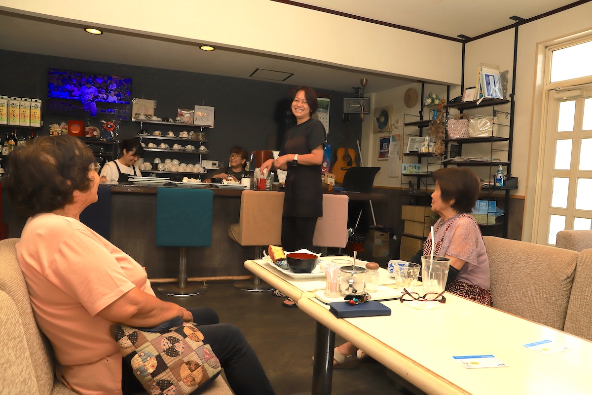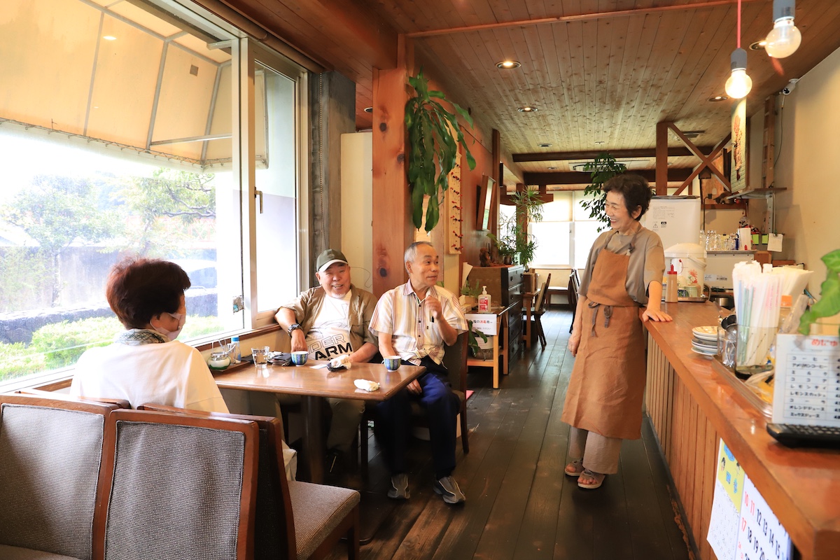 高知市を起点に山あいを抜けて愛媛県へとつながる、国道197号沿いの「喫茶 ブルーメ」。店主の西森由美(にしもりゆみ)さんは、義母からこの店を引き継いで今年で5年目。常連さんが集まるテーブルを見て「今日はあの人来んねえ、あとで連絡してみようか」と笑う。