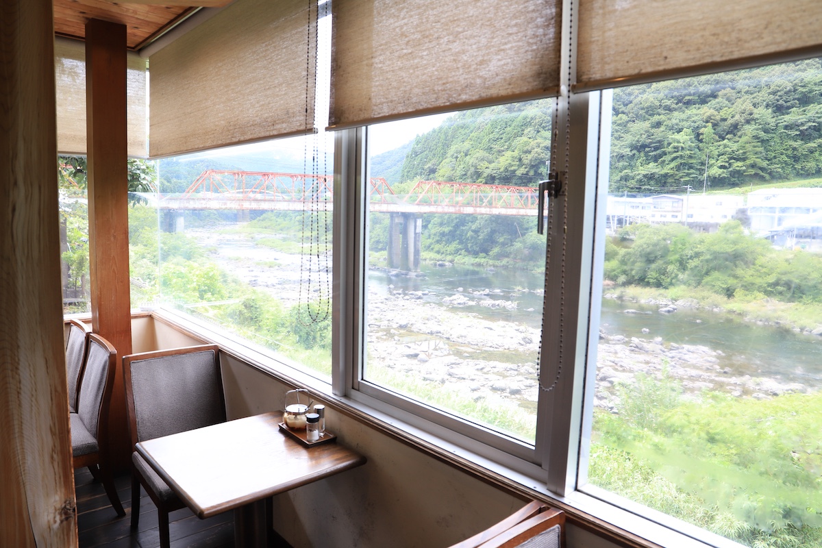 四国山地の奥地から流れてくる梼原(ゆすはら)川が、雄大な四万十川に合流するまち、四万十町大正地域。川沿いにたたずむ「喫茶 橋」の窓辺のテーブル席からは、釣り客が清流に竿を向けるのどかな風景を眺めることができる。