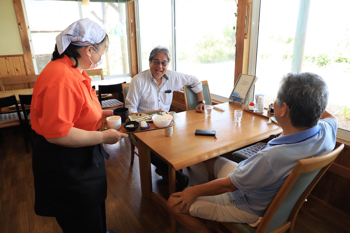 朝の憩いの時間、そんな景色をよそに、地元の常連客が腰掛けるのは、キッチンで仕事をしている店主にいちばん近いテーブル。「とみかさん!」と呼ばれるのは、店主の中平都美香(なかひらとみか)さんだ。「ここは地域の方々が集まってにぎわう交流の場。シーズンになると、夜のうちに火振り漁で取れたアユを持ってきてくださることもあるんですよ」。