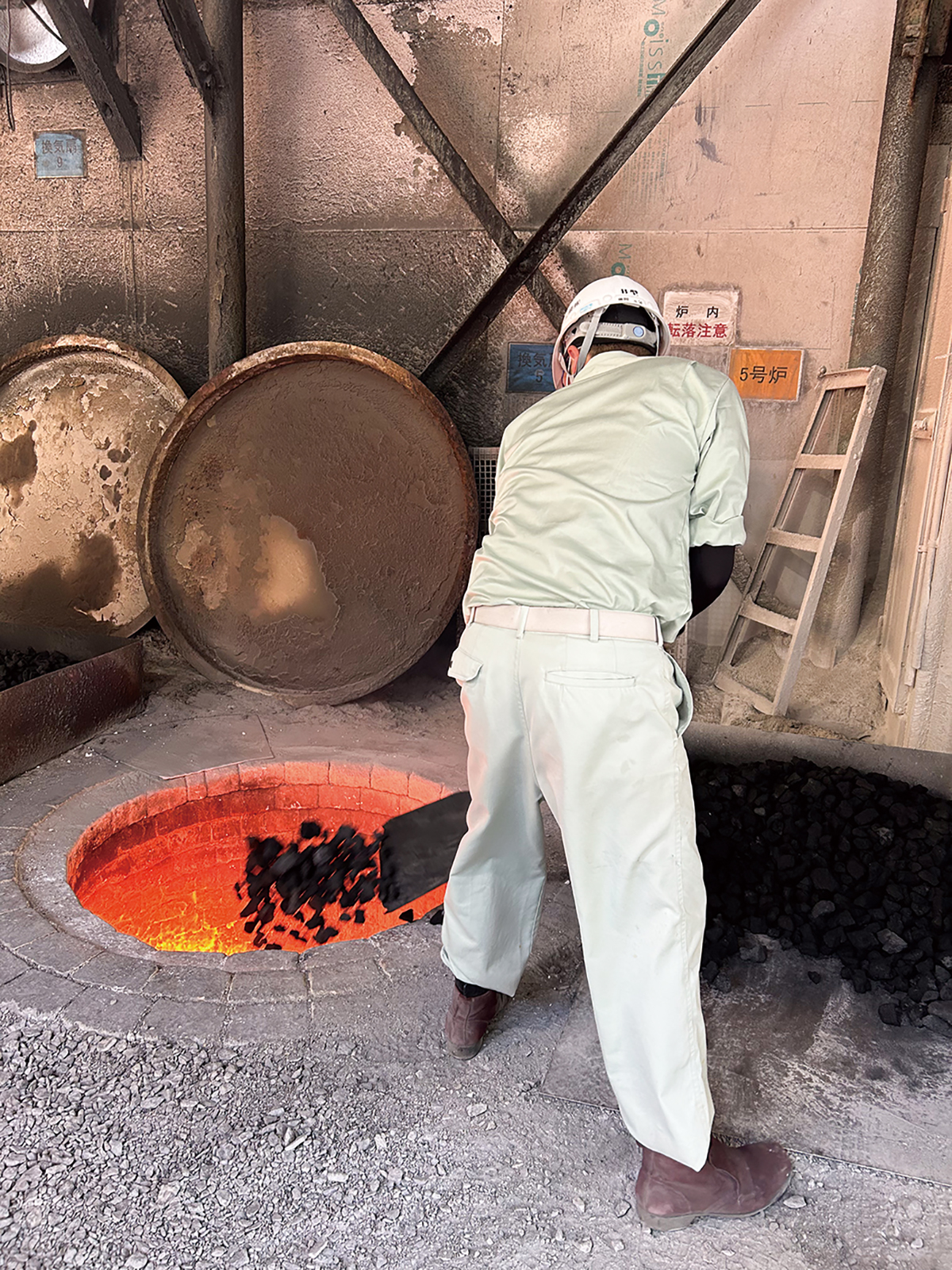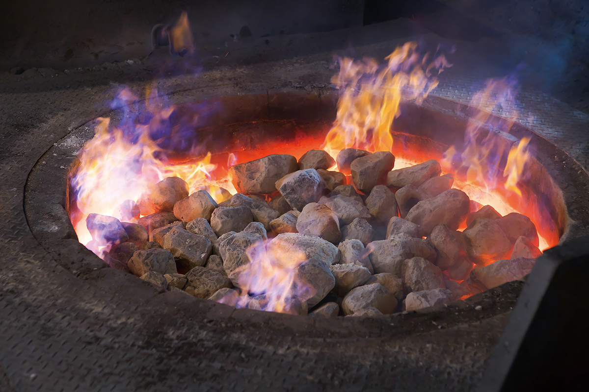 鉱山から運ばれてきた石灰石を土中炉で焼成。高温で熱せられることで灰色だった石灰石が真っ白に変化し、ここから加工が行われる。